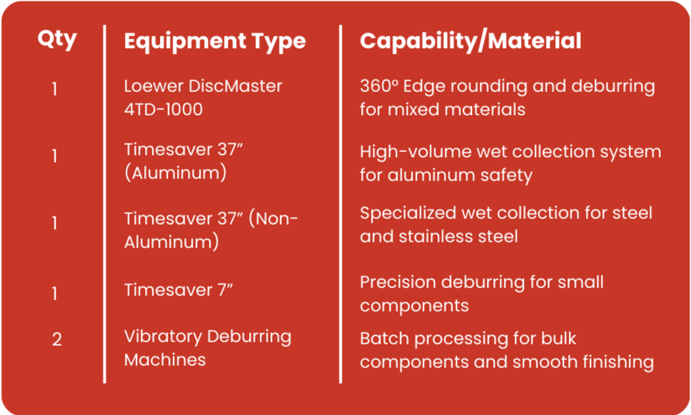 Our facility is equipped with specialized metal deburring equipment designed to handle diverse materials and part sizes. By using the right machine for the right material, we prevent cross-contamination and achieve a high-quality finish across every production run.