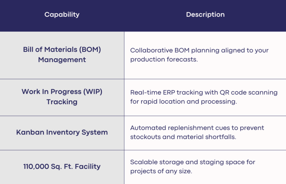 HPM's warehouse management services are designed to take complexity off your plate. From BOM coordination to real-time WIP tracking and Kanban replenishment, our systems are built to keep your supply chain reliable and your projects on schedule. Contact us today to discuss how HPM can support your inventory needs.